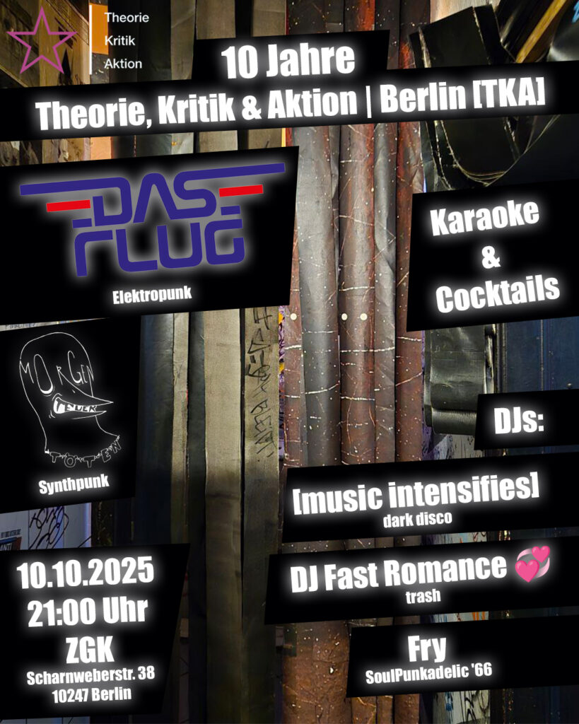 Die TKA ist dieses Jahr 10 Jahre alt geworden. Bevor wir fast schon 11 sind, wollen wir das noch gebührend mit euch feiern. Dafür haben wir ein starkes Programm mit absolut wunderbaren Leuten auf die Beine gestellt um euch und uns einen großartigen Abend zu machen.